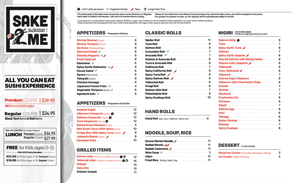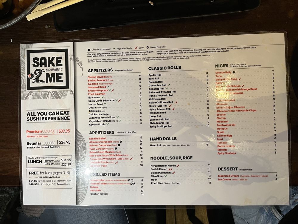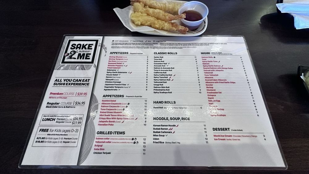 Sake2Me Sushi, located in Fremont, CA, offers a casual and trendy dining experience in a ADA-compliant setting. The menu features a wide variety of Japanese dishes, with a focus on sushi and nigiri. Customers raved about the fresh and high-quality fish, with favorites like the Hawaiian roll, Lion King roll, and seared Cajun albacore nigiri standing out. The AYCE option is popular, with the premium menu offering a plethora of options to choose from. Customers appreciated the attentive service and the ability to accommodate large groups. Overall, Sake2Me Sushi provides a great dining experience with its delicious food, quick service, and comfortable ambiance.
