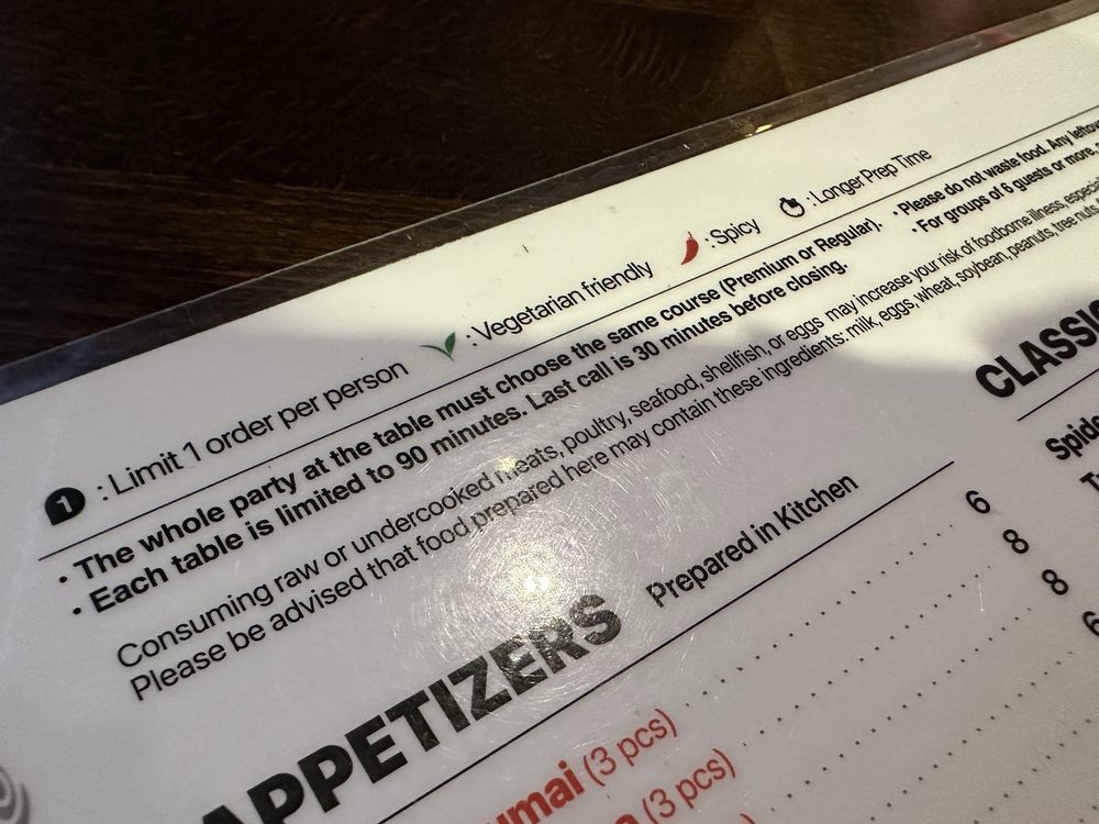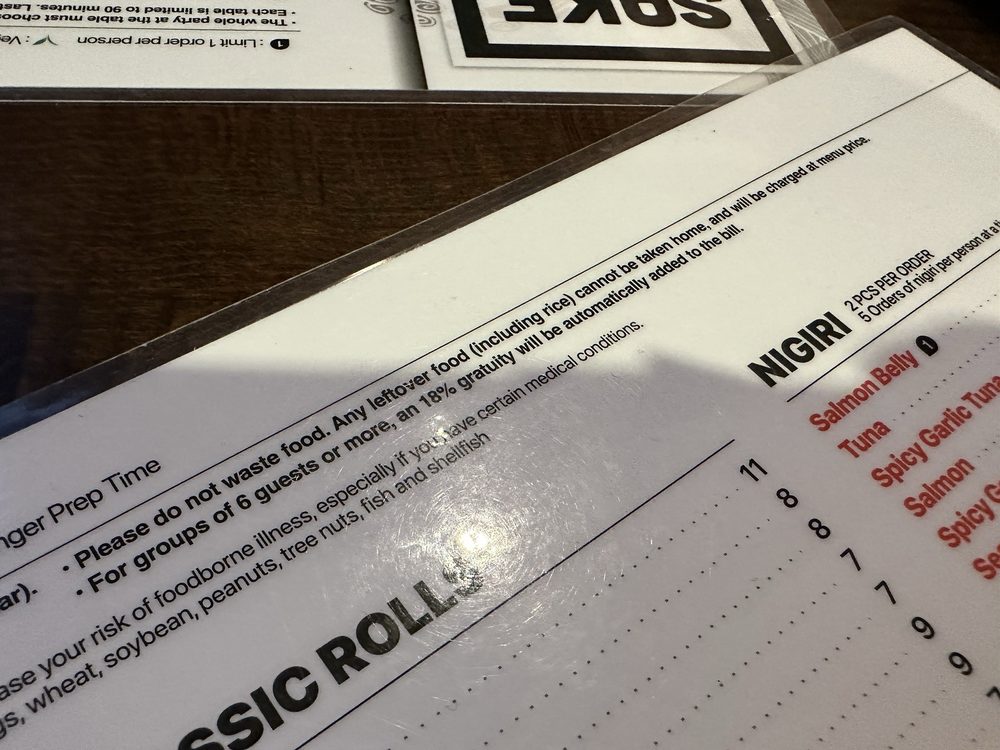 In - salmon, avocado, cream cheese out - salmon, umami sauce.
