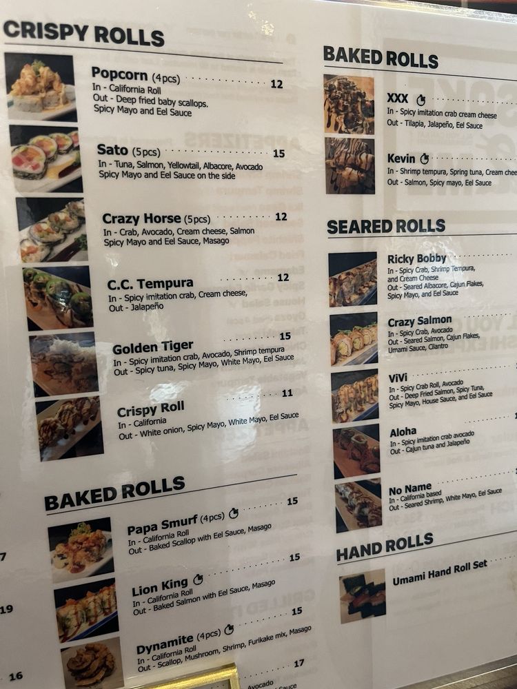 In - shrimp tempura, spicy crab out - spicy tuna, albacore, jalapeno, spicy garlic ponzu, a hint of sriracha, eel sauce.